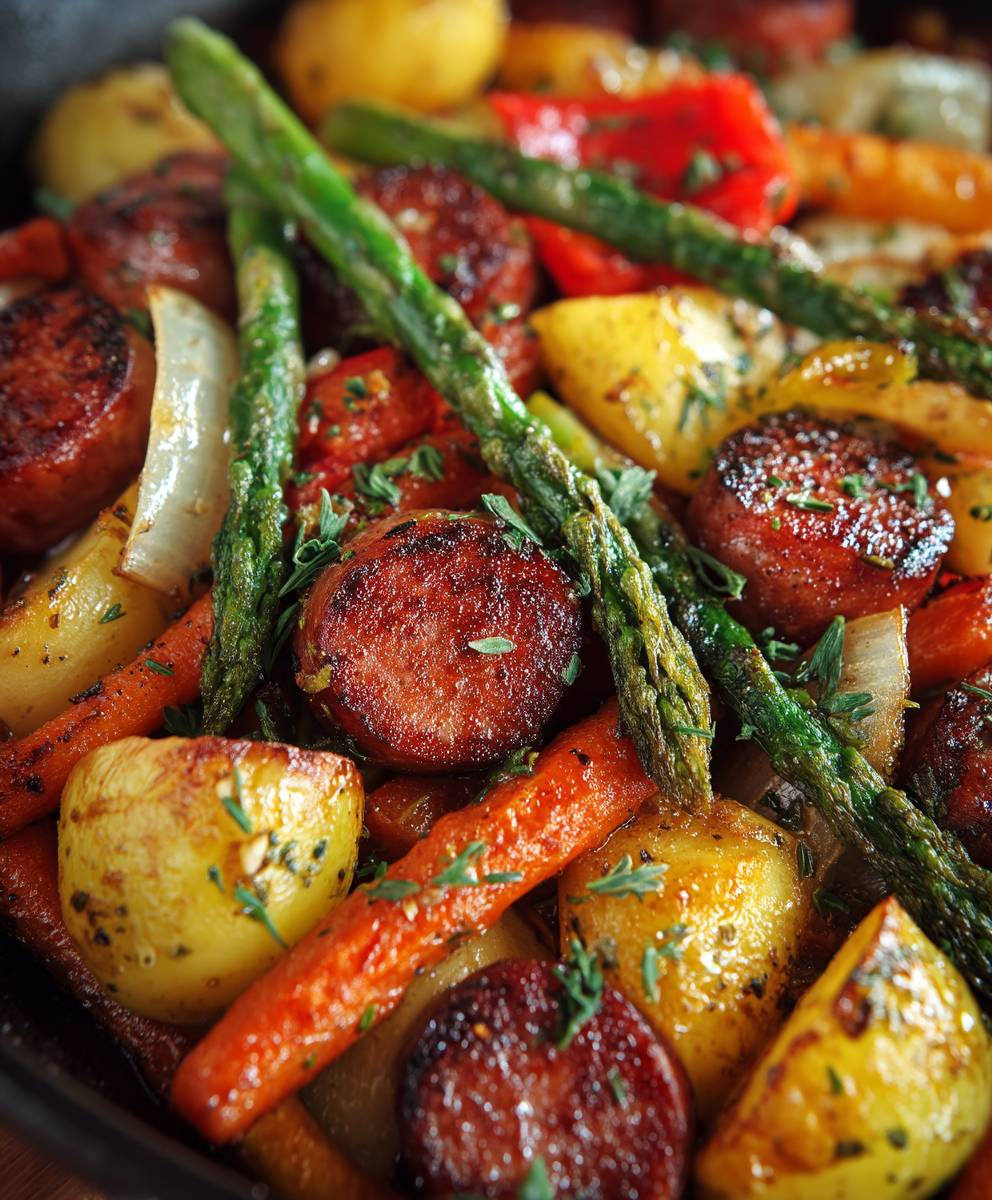 - Step 6: Remettez la plaque au four et poursuivez la cuisson pendant 10 à 15 minutes supplémentaires, ou jusqu'à ce que les légumes soient tendres et légèrement caramélisés, et que la kielbasa soit bien dorée. Servez immédiatement.