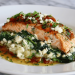 - Top pizza with flaked salmon, spinach, and feta